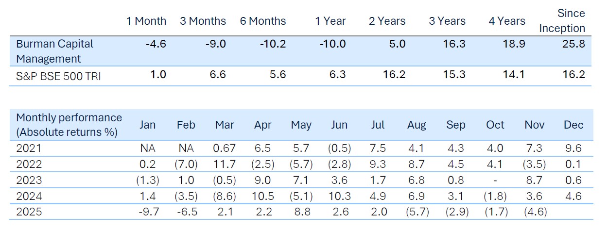 The last fourteen months have been a tough period in Indian equity markets especially at the small-cap end of the spectrum – the BSE Small Cap index is still down 10% from its peak in Sep-24. While our portfolio had been resilient over a large part of this period (0.6% returns from Sep 24 to Aug 25 vs -6.7% for our benchmark BSE 500 TRI and -9.9% for BSE Smallcap), the last three months have seen a significant drawdown.