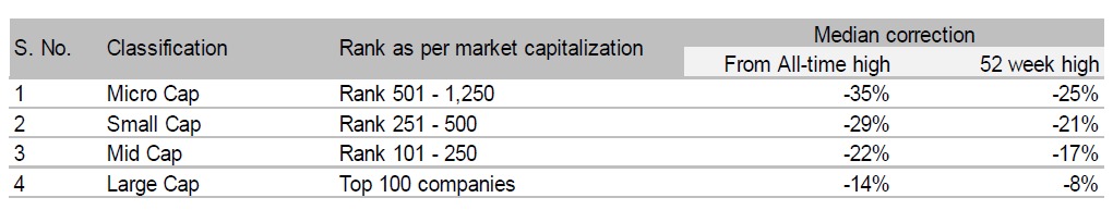 As per AMFI (Association of Mutual Funds in India) definition, stocks with market cap rank of less than 250 are classified as small caps. But even within small-caps, the ‘micro’ small-caps (Rank 501-1,250) have suffered more with median correction of 27% and 37% from 52-week highs and all-time highs,